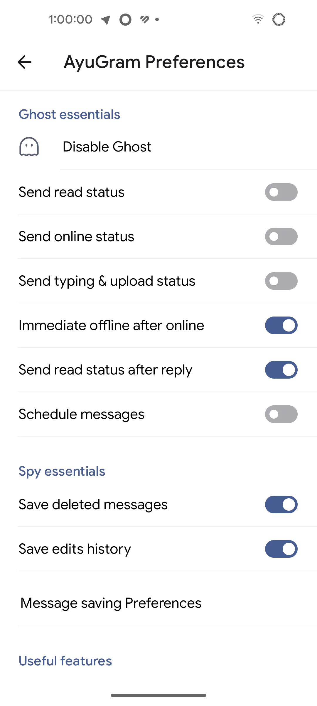 Полноценный ghost-режим позволяет полностью скрыть ваш онлайн-статус, даже когда вы активно пользуетесь мессенджером: пишете сообщения, читаете чаты или находитесь в сети. Это одна из ключевых функций, отличающая AyuGram от официального клиента.