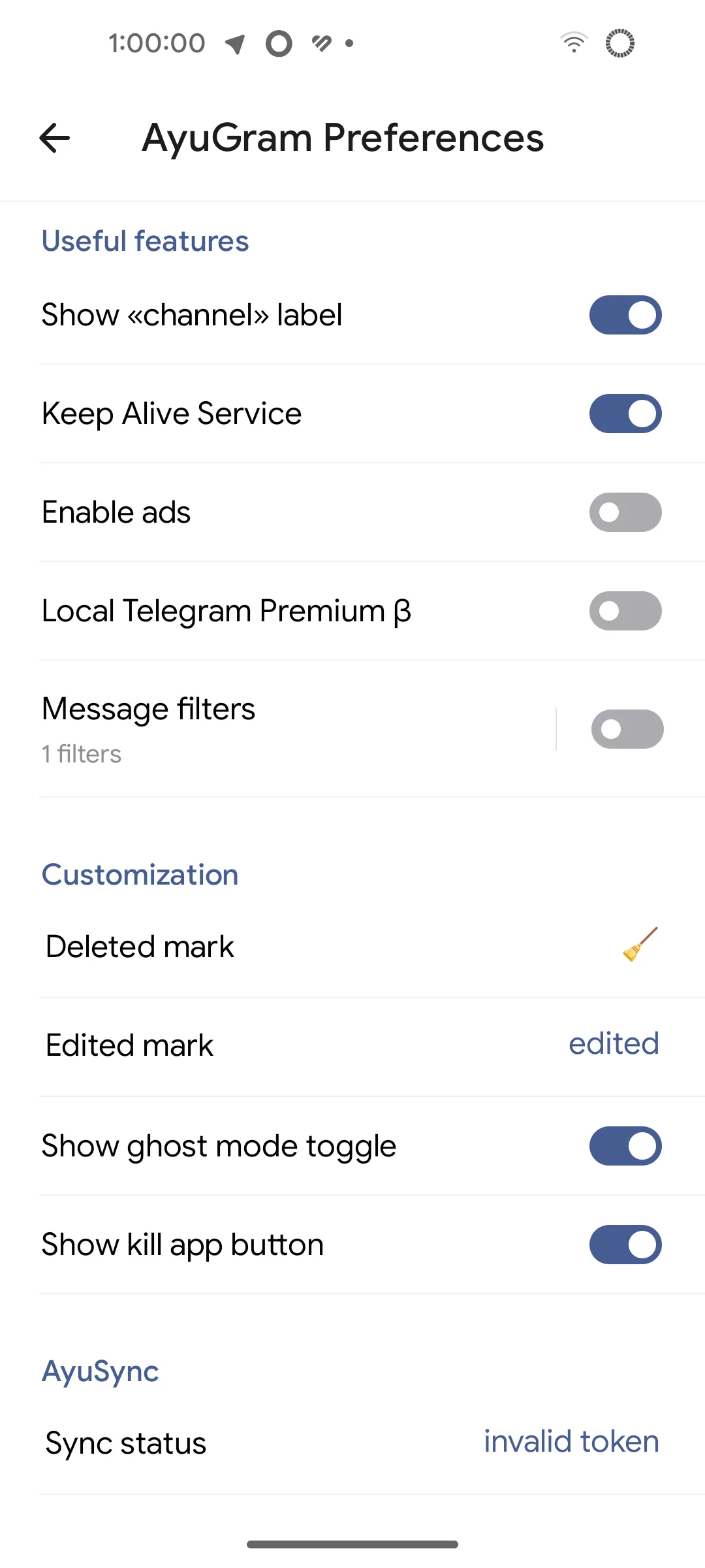 Приложение поддерживает синхронизацию прочтений через AyuSync и сохраняет совместимость с актуальными версиями Telegram API, обеспечивая стабильную работу и доступ ко всем основным функциям мессенджера.